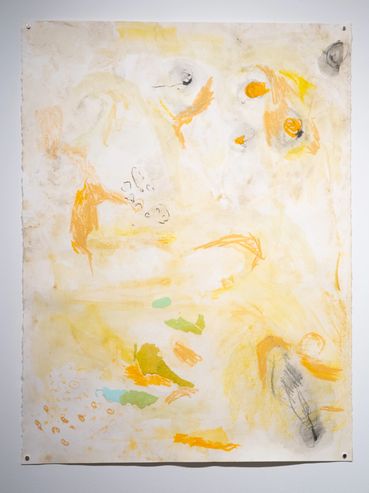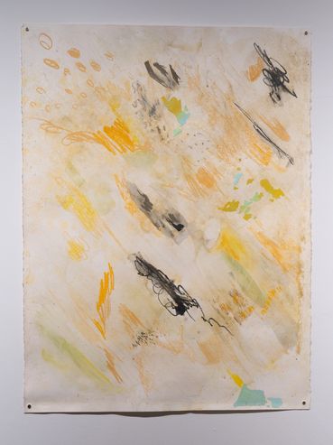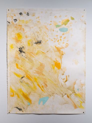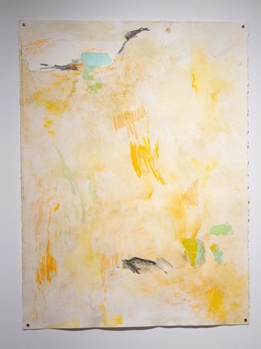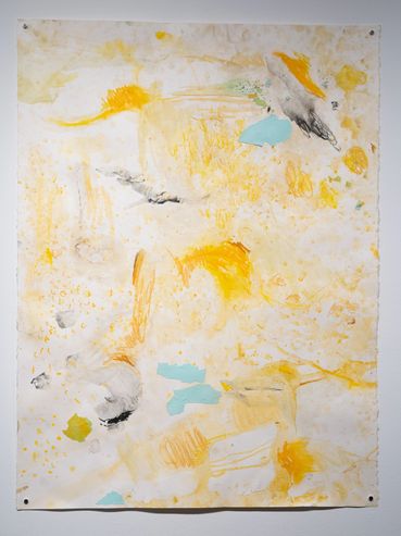 The water falls, and the paper receives it. The marks, the colors, the flow permeate the fibers. Like the sound of the brush moving across the wall, the water flowing, and the nails pressing into its hard surface, these works now allow us to hear the chalk, the materials, the marks left on the paper, bringing us back to the memory of that moment. These pieces capture the reminiscence of history found in the paint on the yellow wall, the wall of memory.